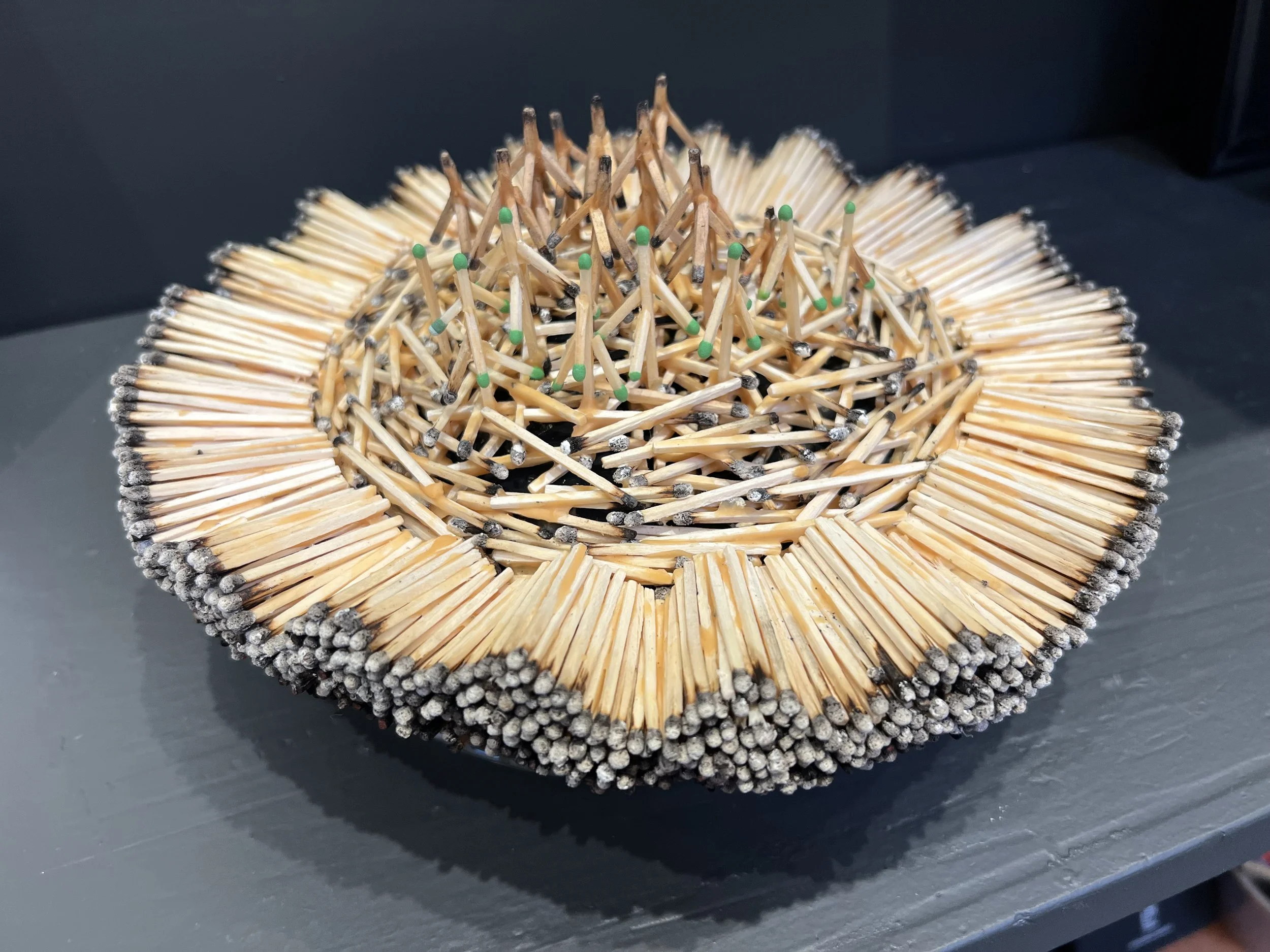 Matchstick Sculptures by Karen Hackenberg: Handbasket (basket shape), Blight (nest shape on branch), Singe (pie shape)